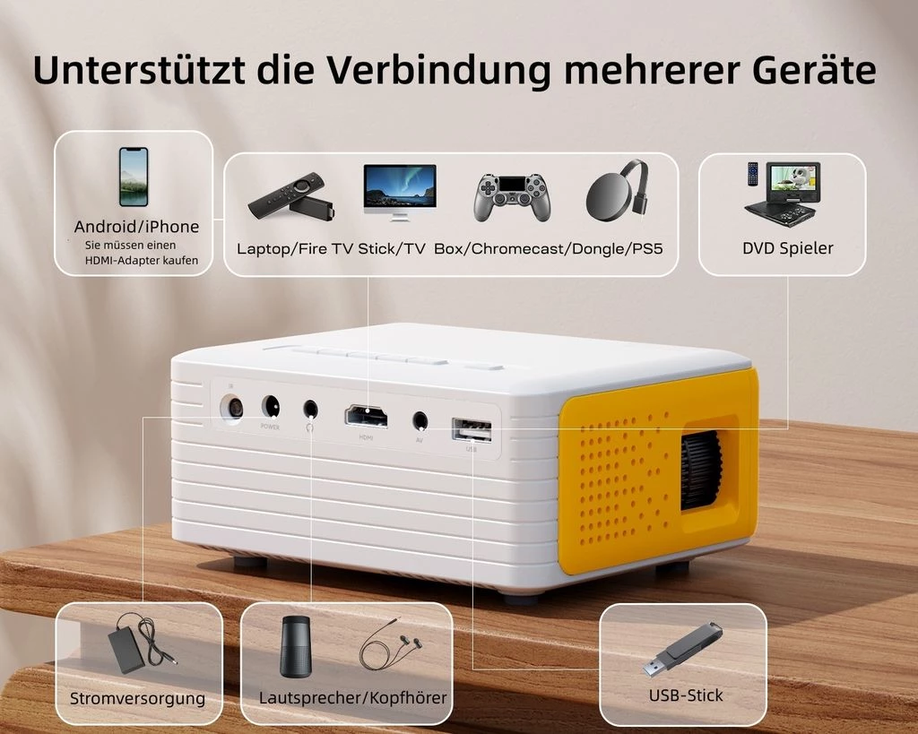 Ten przenośny mini projektor ma kilka interfejsów, takich jak HDMI, AV, USB i AUX, dzięki czemu nadaje się do użytku w różnych sytuacjach. Ponadto możesz podłączyć go do systemu audio, aby uzyskać wciągające wrażenia z kina domowego.